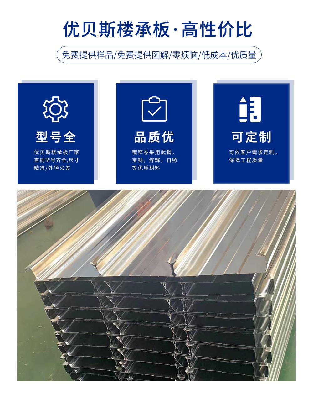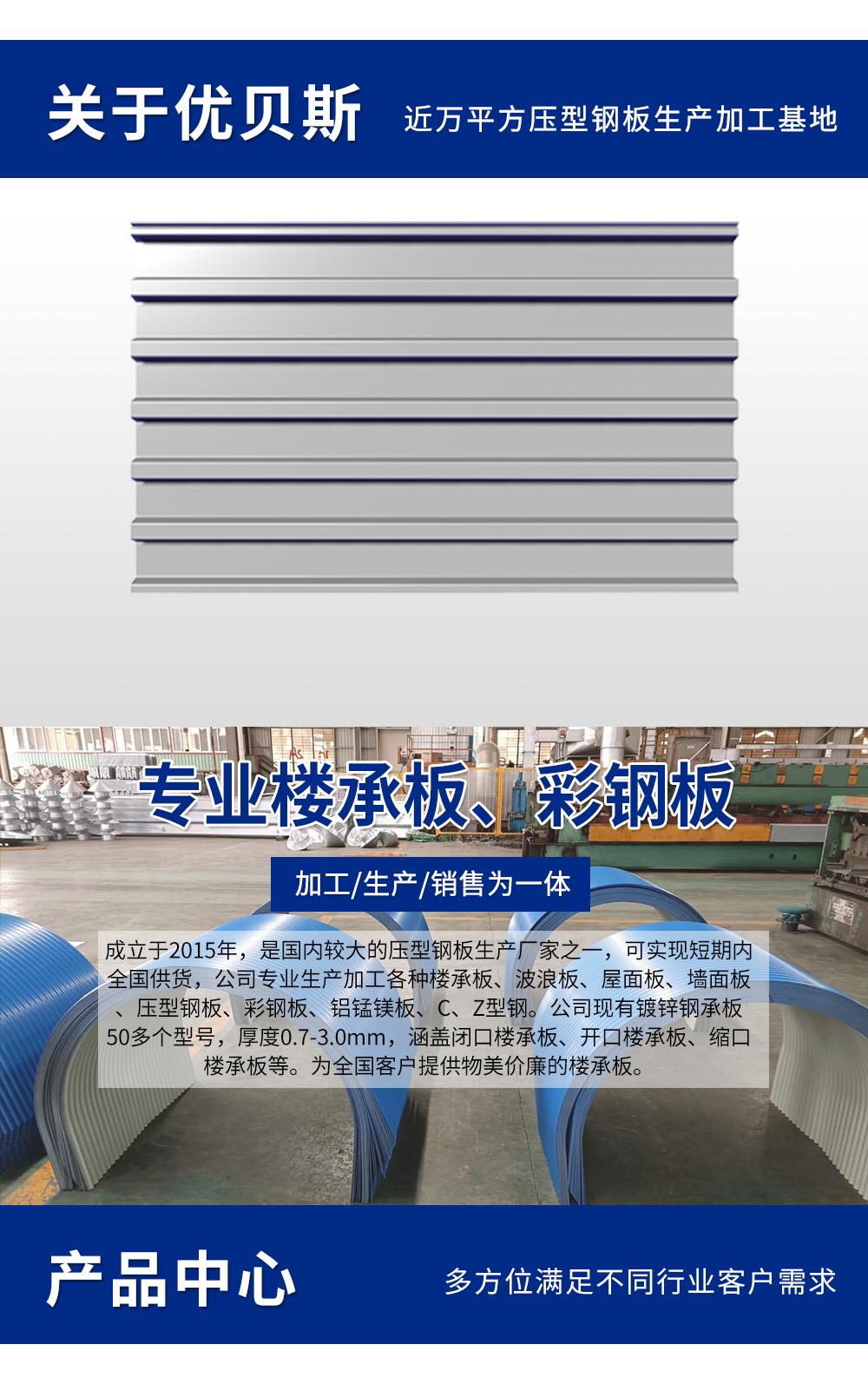 優貝斯樓承板公司是長三角樓承鍍鋅樓承板、彩色壓型鋼板生產基地,主要產品有閉口樓承板、開口樓承板、壓型鋼板組合樓板、屋面板、墻面板。厚度足,免費拿樣。拿樣電話:178-0250-2786